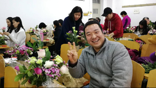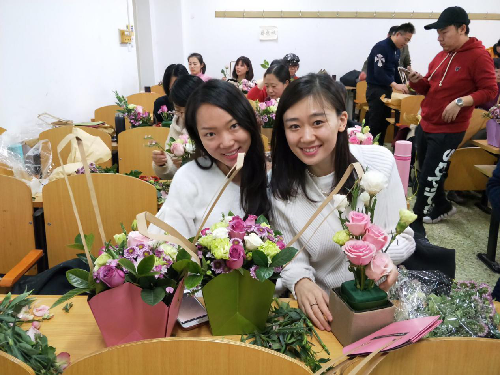 接下来插花环节,花艺师通过ppt,生动形象地给大家讲解了插花的概念、插花的艺术风格、花材花语、鲜花保养和桌花制作的相关知识。随后,老师们在花艺师指导下制作小花篮。她们巧妙构思,精心修剪花材,小心翼翼插枝造型。形态各异的花篮,展示了不同的审美情趣和追求,其中实验中心的郭兴华老师和广告学系许敏玉等两位老师的作品,得到了大家的交口称赞。花美人更美,一组组姊妹花造型的照片,呈现出一幅幅人面鲜花相映红的图景;大合影中,手捧鲜花的美丽女神们围着可爱的“绿叶”——石院长笑逐颜开。一个多小时的时间不知不觉过去了,大家带着自己的得意之作和满满的幸福,踏上归途。