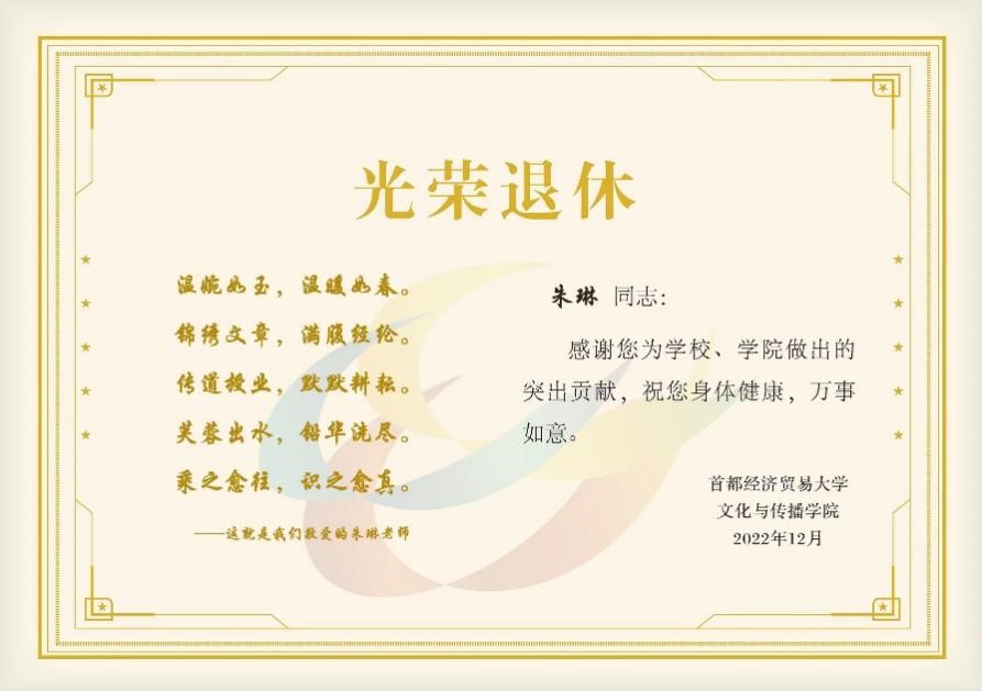 朴实的话语,写满了离别的不舍。退休欢送会结束后,学院人文与传媒教学实验中心为朱琳、杨景越两位教师拍摄了精美的退休纪念照。两位老师对学校的热爱和对教育事业的无限眷恋,激励着全体在岗教师继续勇挑重担,为学校、学院的建设发展添砖加瓦。同时,此次退休欢送会的举办也体现了香蕉视频 尊师重教的浓厚氛围和学院分工会在提升教师幸福感工作方面所做的努力。