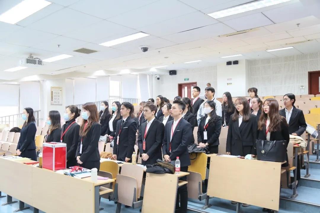 十三点四十分,大会正式开始。全体参会成员起立,面向国旗,奏唱国歌。