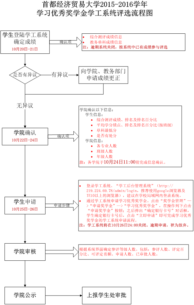 1.提交申请。学生本人或集体(团队)负责人向所在学院提交书面申请。各类表格模版请见本通知附件2。学习优秀奖学金学工系统评选操作流程详见下图。