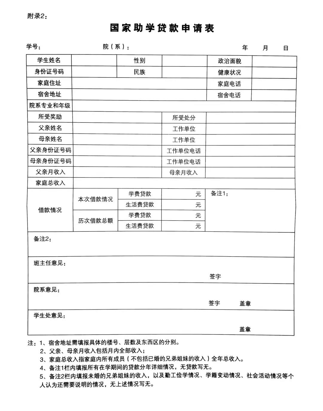 ※备注:见附录2:《家庭经济困难学生认定申请表》、《国家助学贷款申请表》,表格复印有效。贷款总额本专科生不超过8000元/年,研究生不超过12000元/年。如有不明事项,请拨打咨询电话010-83952279/1579。