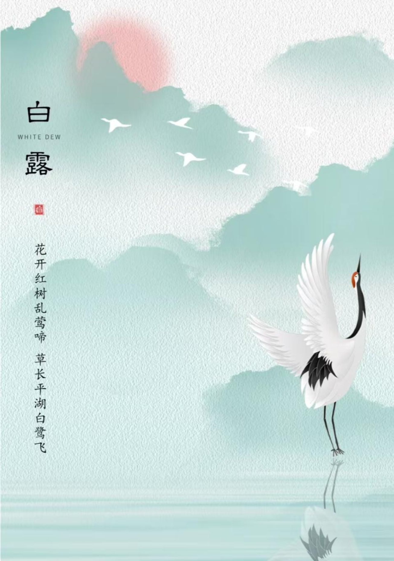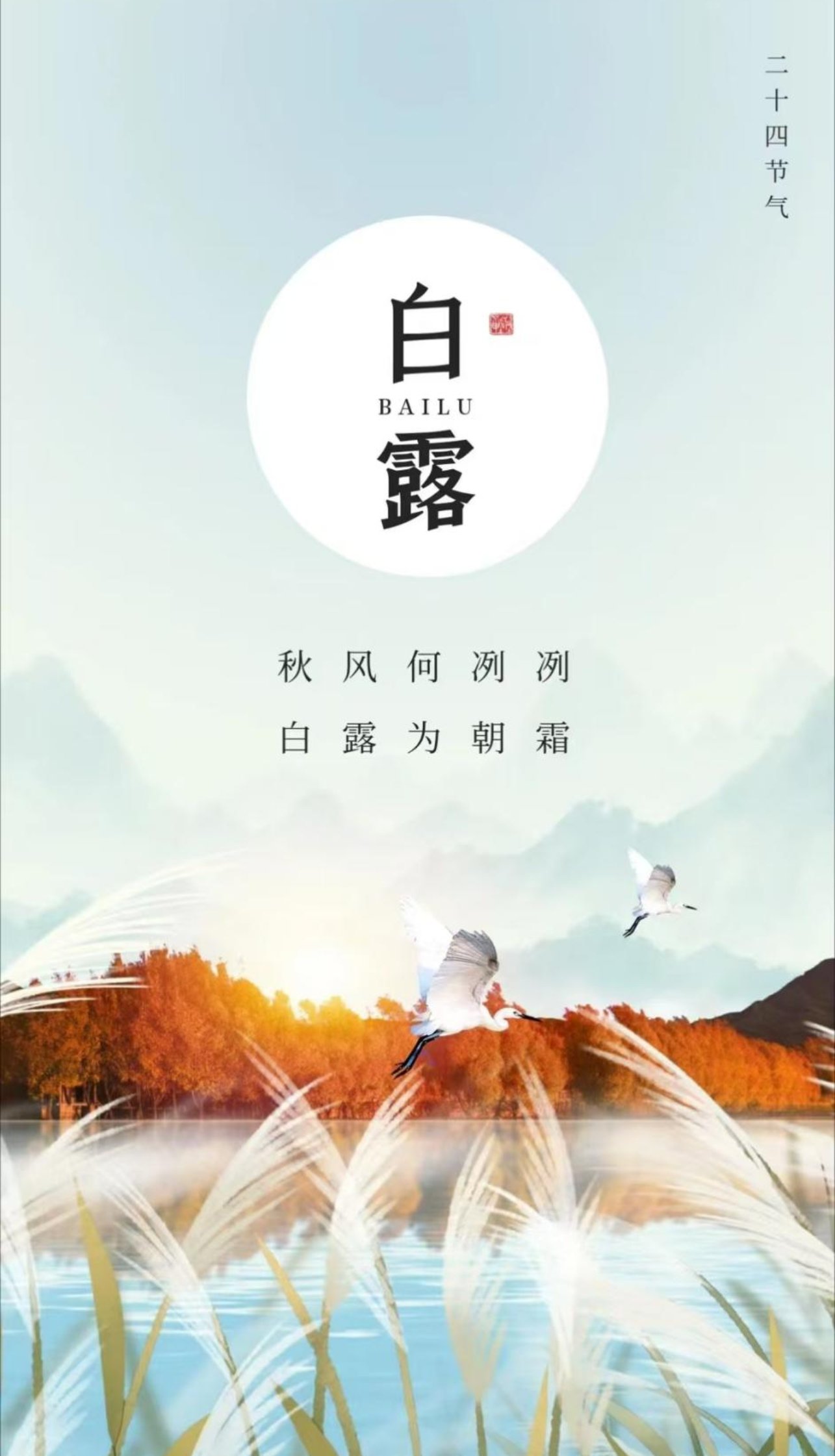 白露,是二十四节气中的第十五个节气,也是秋季的第三个节气。白露是反映自然界寒气增长的重要节气。随着白露的到来,夏天的闷热随之结束,天气渐渐转凉,寒生露凝。古人以四时配五行,秋属金,金色白,以白形容秋露,故名“白露”。此时节,菊黄枫红,草木凝烟,石榴满枝,丹桂飘香,大地上一片金黄,空气中弥漫着稻香。白露过后,气温逐渐下降,日照减少,昼夜温差增大。