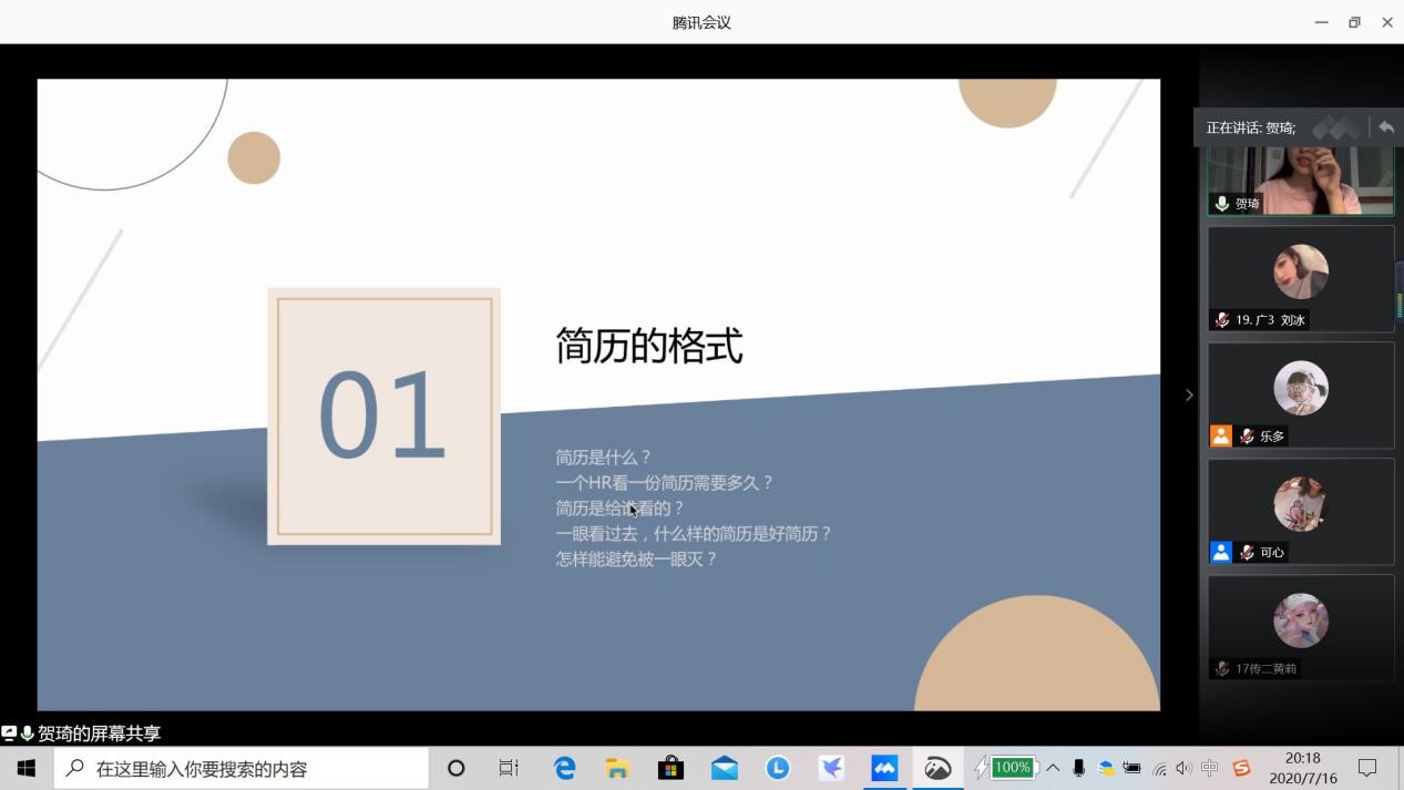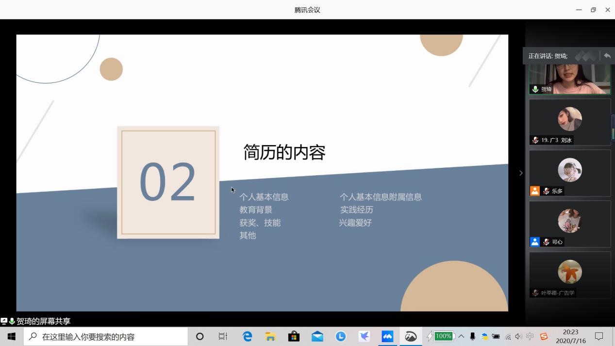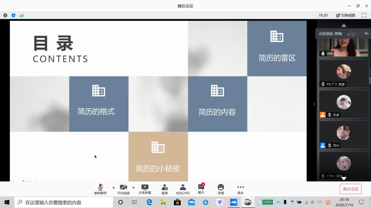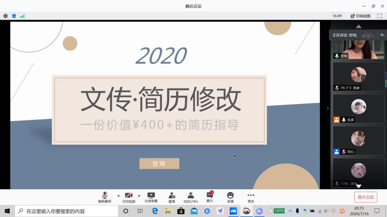 盛夏已至,酷暑的炎热也阻挡不了同学们实习、求职的脚步,若写得一份漂亮的简历,就如同为自己无形之中画了一个得体的“妆容”,让自己在人群中脱颖而出。为了帮助同学们提升制作和修改简历的能力,让更多的同学们赢在起跑线上,香蕉视频 分团委社会实践部于2020年7月16日开展了简历指导分享会,特邀贺琦学姐对在校同学的简历制作及修改进行指导,在线为同学们解决各种“疑难杂症”。“职”等你来简历指导分享会是香蕉视频 “扬帆未来,筑梦远航”生涯规划系列活动之一。