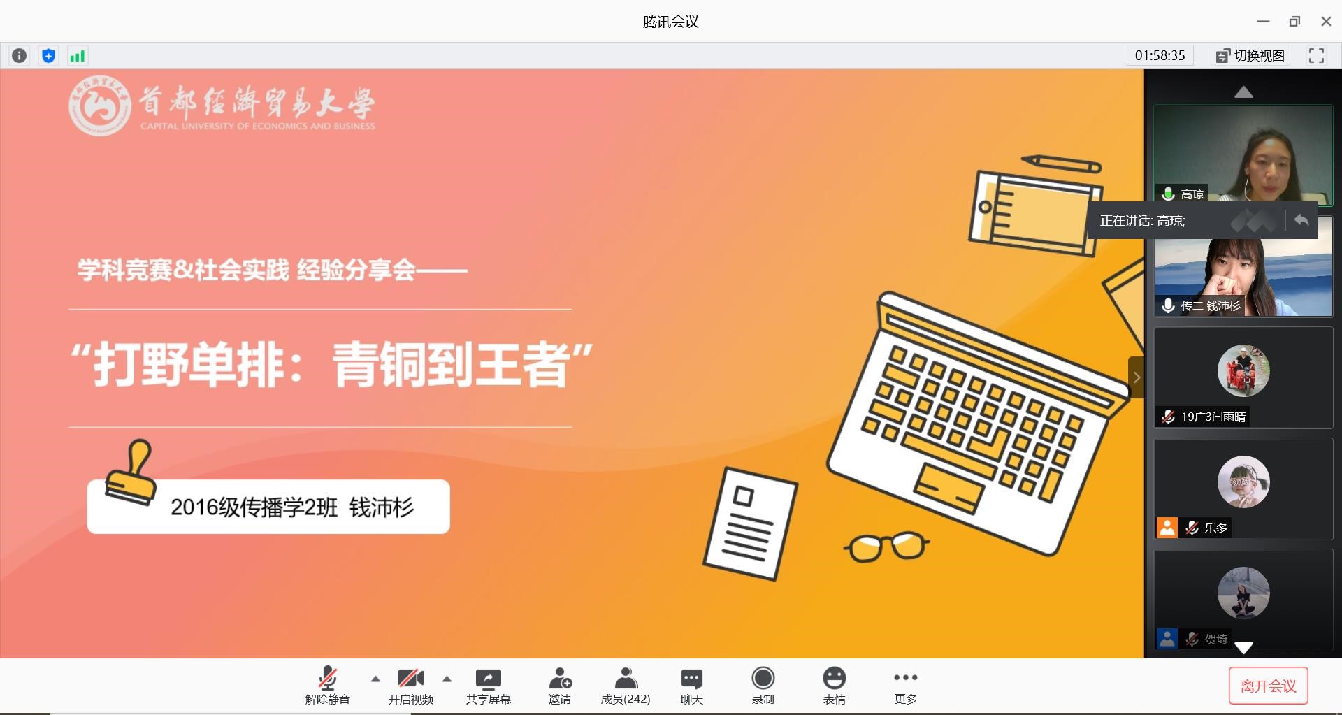 然后,高琼老师向我们分享了学科竞赛带给我们的乐趣和挑战。她详细地介绍了如何获取学科竞赛的报名信息、如何以自己的专业知识等要素选择学科竞赛、如何评估比赛级别和含金量。除此之外,高琼老师向我们讲解了往届优秀的比赛作品,分析了调查过程、问卷等比赛作品中的重要部分。最后,高琼老师也分享了在比赛时的一些经验和需要注意的问题。