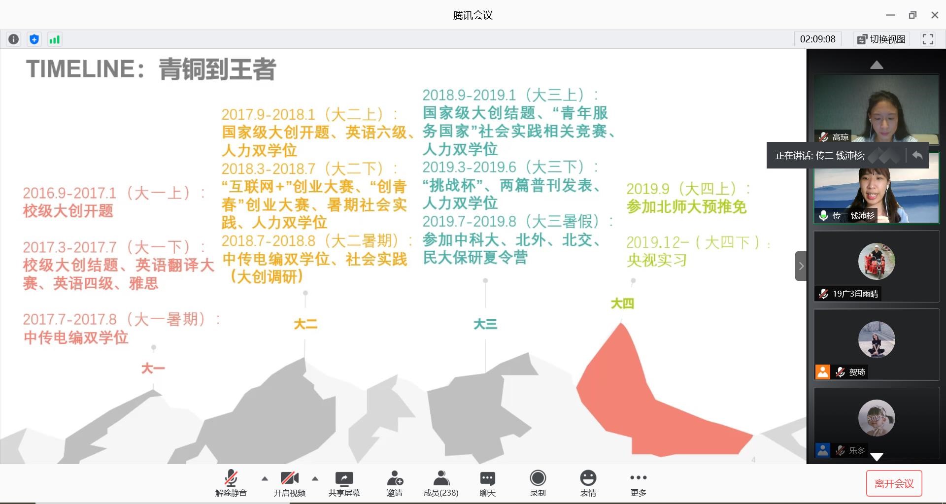 最后,钱沛杉学姐为我们分享了她的学科竞赛和社会实践经验。她为我们讲述了她以自己的专业为基础,从创新扩散视域下解决问题,由暑期社会实践出发,结合“互联网+”、“创新杯”等竞赛的元素,形成学术论文,参加比赛。