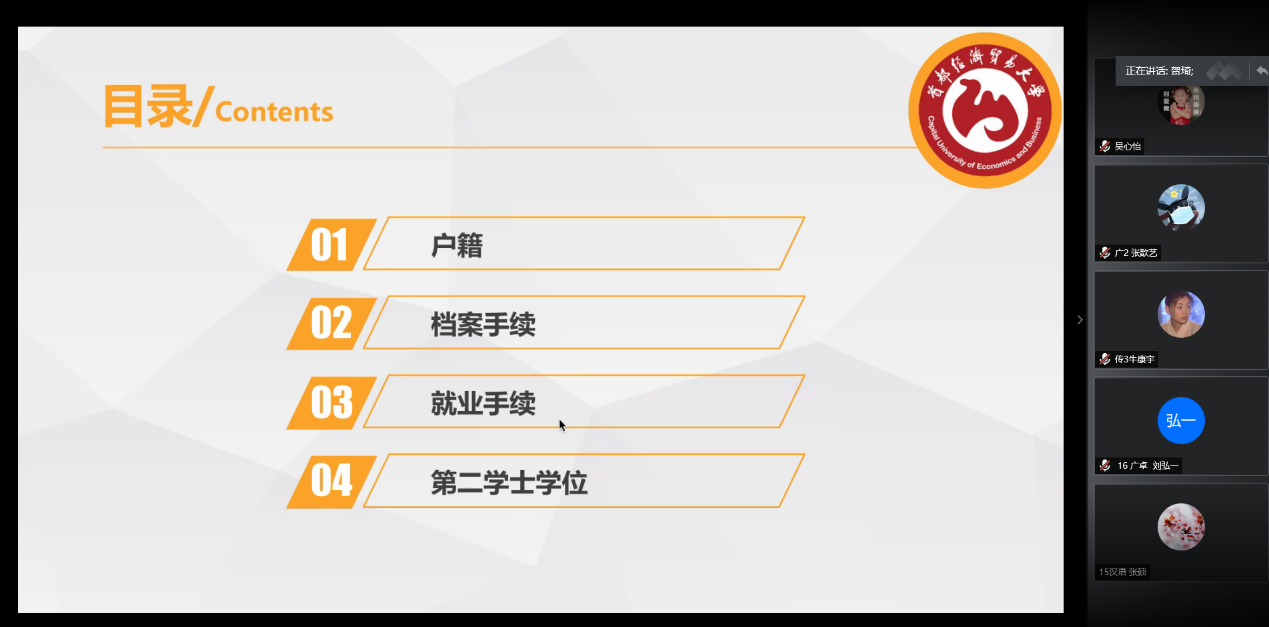 贺琦对户籍、档案手续、就业手续和第二学士学位四方面的问题进行了说明,对第二学士学位的面向群体、学制、优势等问题进行了详细解说。同时贺琦老师针对同学们有关户籍、档案手续、就业手续三方面需要注意的问题进行提醒。