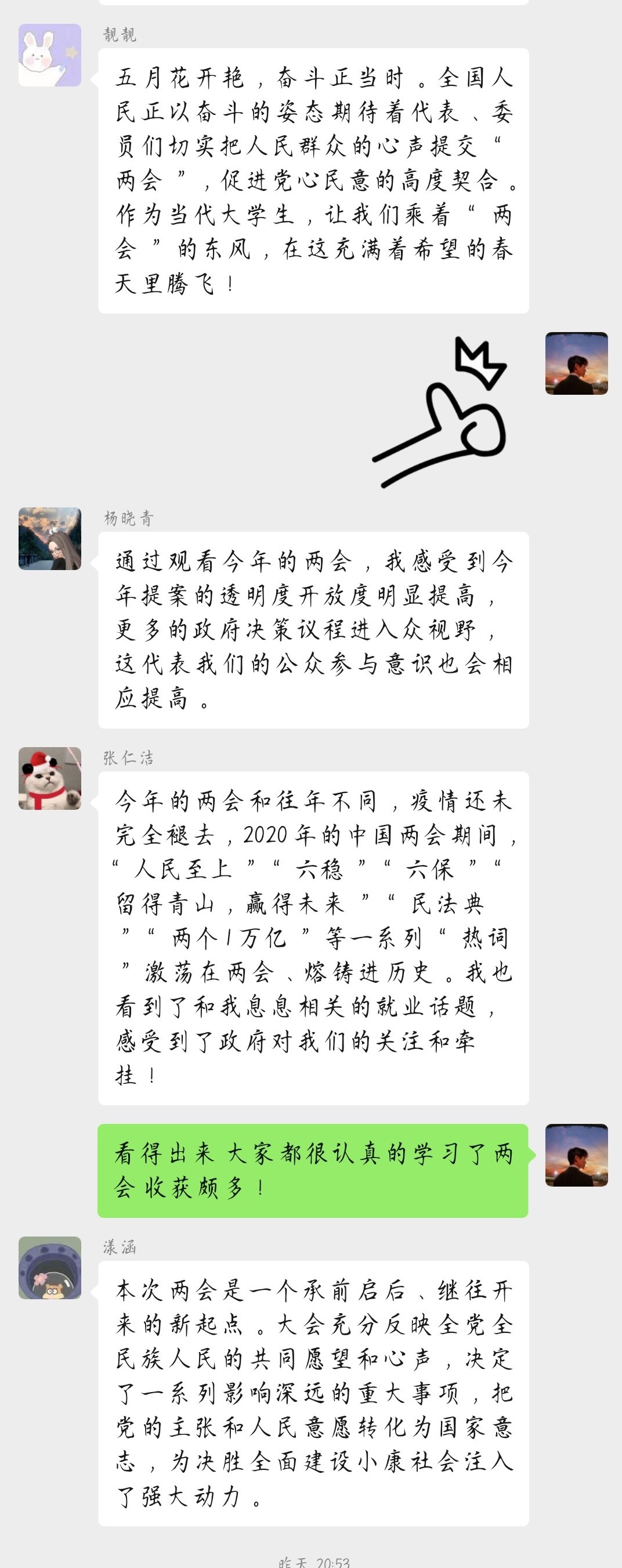 不凡之年,信心之会。从“延迟”到“重启”,在疫情防控常态化阶段召开“两会”,不仅是国家给全社会注入的一剂战“疫”必胜的“强心剂”,还是向全世界传递了患难与共的中国担当、唱响了坚持开放合作的中国旋律,为全球团结抗“疫”提振信心。希望香蕉视频 团员青年以此次学习为契机,将学习贯彻习近平新时代中国特色社会主义思想引入新阶段、推向新高潮,了解社会发展趋势,关注“两会”热点信息,明确学习目标,增强学习动力,努力成为新时代中国特色社会主义思想的建设者和接班人。