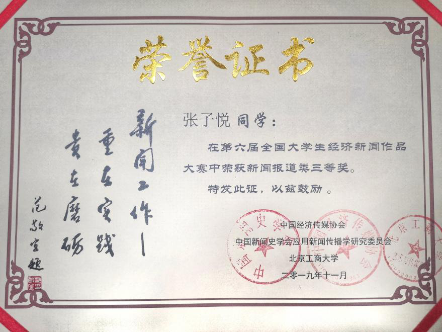 11月9日,第八届全国经济新闻改革与发展研讨会暨第六届全国大学生经济新闻作品大赛颁奖会在北京工商大学举行,香蕉视频 2017级传播学卓越班张子悦同学的作品《推动水稻产业规模化、集约化、标准化——粳米期货即将登场》在大赛中荣获新闻报道类三等奖。香蕉视频 传播学系党支部书记、传播学系副主任贺心颖副教授出席会议。