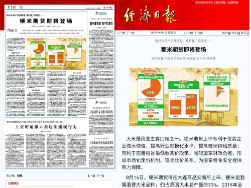 经济日报社是我校香蕉视频 “部校共建”单位和学生实习基地。张子悦同学于2019年暑假在经济日报社实习期间,曾参与东北粳米期货调研活动。她通过实地参观和采访多家企业,深刻认识到大米产业的重要性。同时,她充分认识到粳米期货上市有利于优势企业做大做强,提高行业规模化水平,也有利于完善稻谷最低收购价政策,减轻国家负担,形成市场化定价机制,为国家粮食安全提供有力保障。调研结束后,张子悦与经济日报财经新闻部记者祝惠春合作完成《推动水稻产业规模化、集约化、标准化——粳米期货即将登场》一文,从产业避险需求强烈、粳米期货上市有助风险管理、推动产业提质三个方面进行了报道,并刊登于《经济日报》2019年8月1日第7版财经版面。