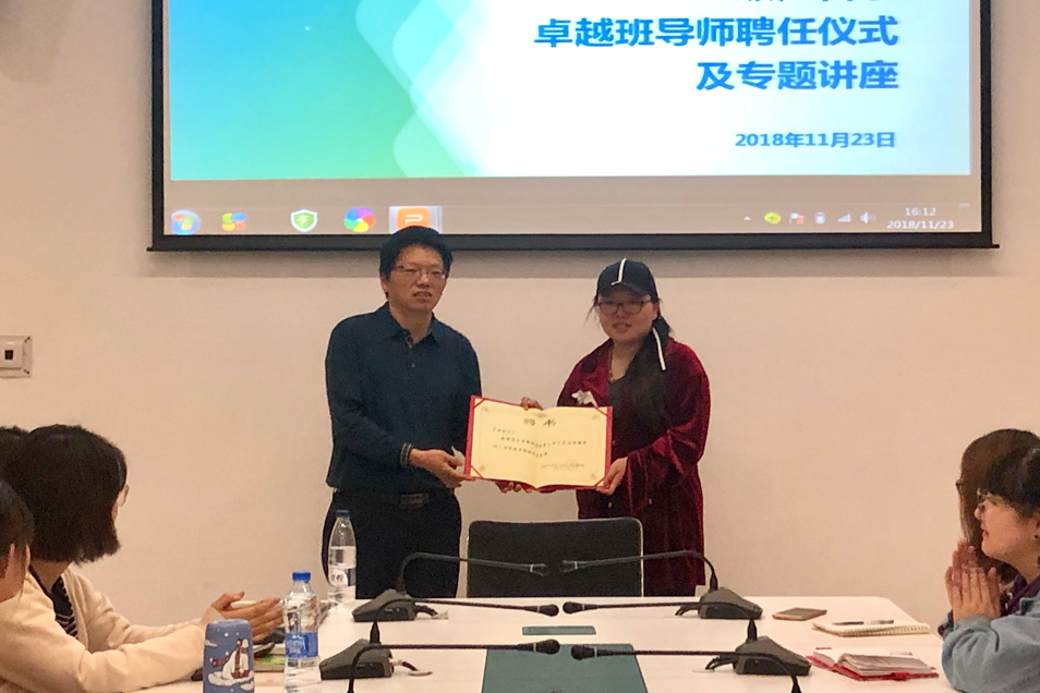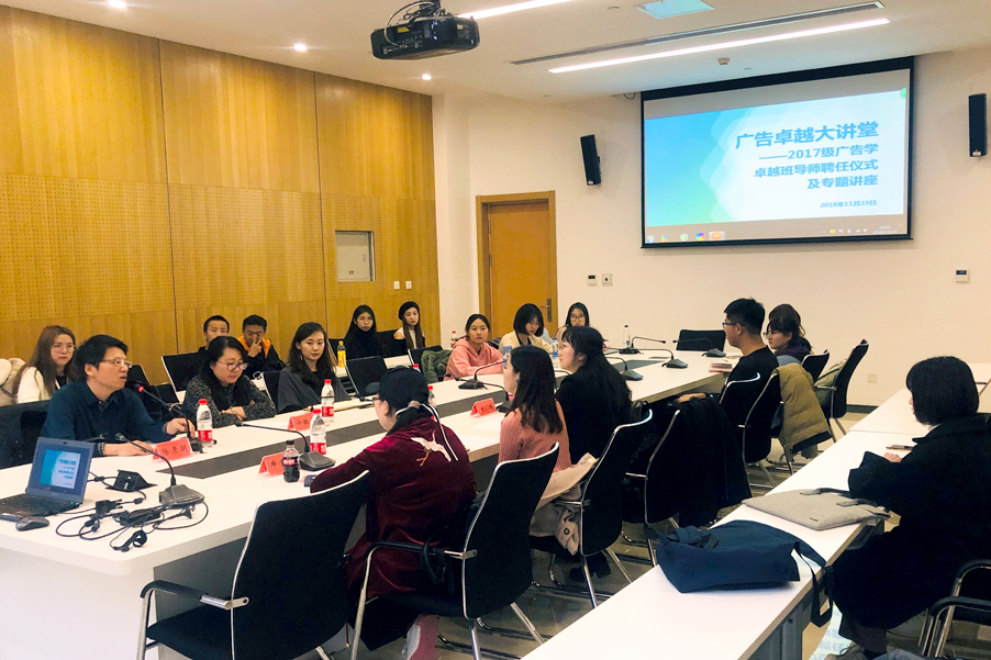 11月23日下午,2017级广告学卓越班导师聘任仪式及广告卓越讲堂在博远楼2号会议室举行。来自蓝色光标、UI中国的两位行业导师、香蕉视频 副院长陆彦明、院长助理许敏玉、专业导师王端、王子琪老师以及17级广告学卓越班的全体同学参加了此次活动。
