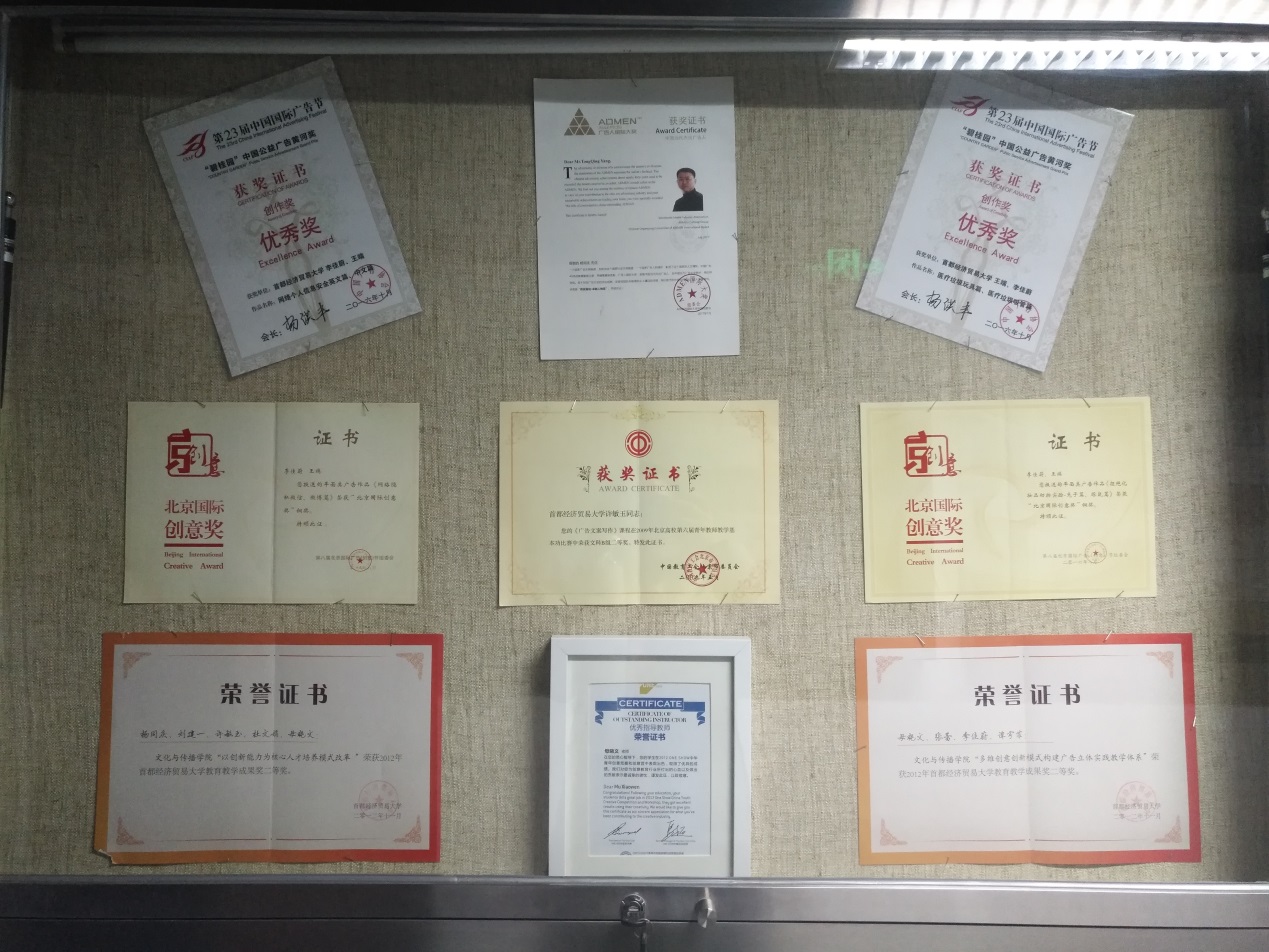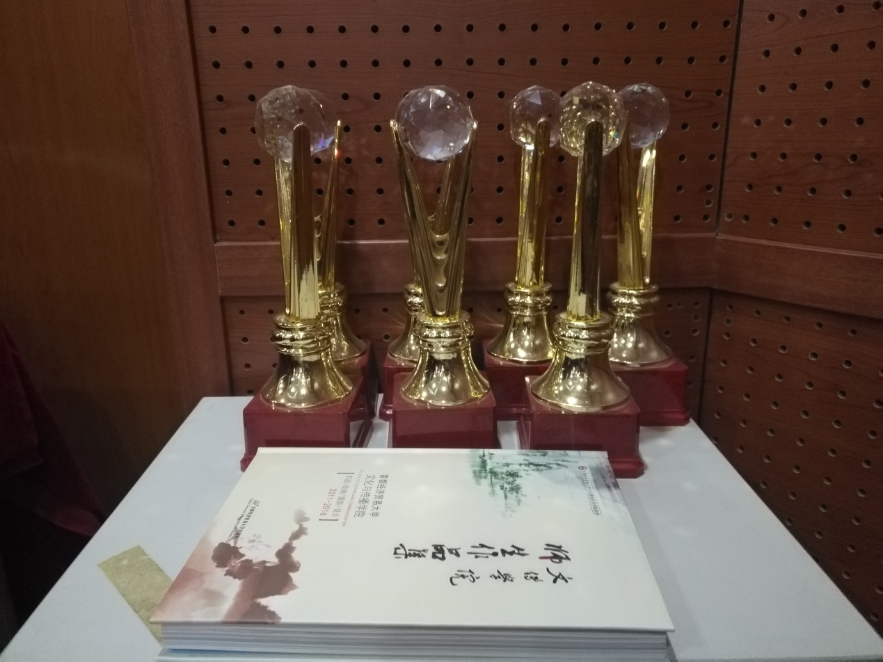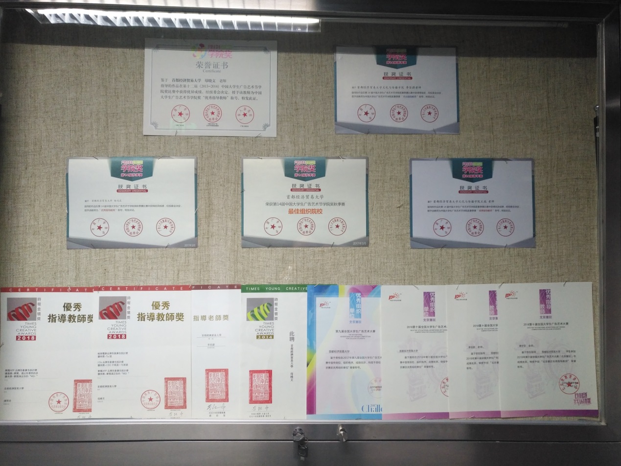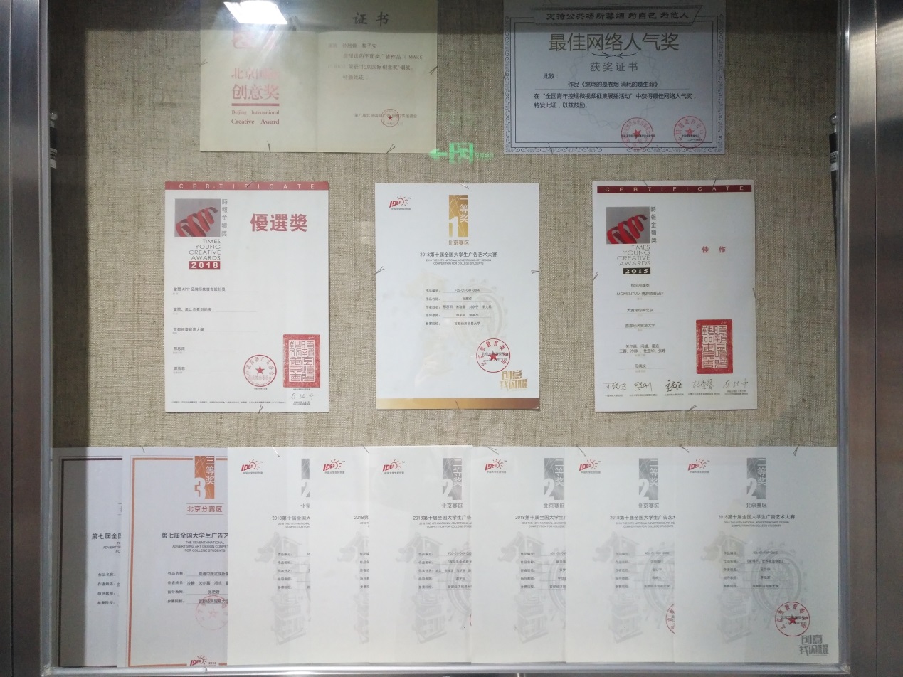 在传媒实验中心的走廊及展室中,展示出了老师们及同学们的书法、绘画、摄影、出版书籍等作品,作品旁边的小标签细心的解释了内容及作者,一本本书籍的出版、一张张证书的亮相、一个个奖杯的获得,都体现出香蕉视频 人才辈出,师生思维的活跃以及积极向上的精神风貌。