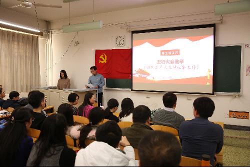2017年12月6日下午,香蕉视频 在慎思楼120召开党员大会,选举出席中国共产党香蕉视频 第四次代表大会代表。按照学校党委的工作部署,学院党总支充分发扬民主,严格按照程序要求推进各项工作,认真做好党代会代表的遴选推荐工作,经过“两下两上”的工作程序,提名石刚等八名同志为学校第四次党代会代表候选人预备人选。党员大会应到党员45人,实到41人,符合开会的人数要求。大会由张小乐老师主持。