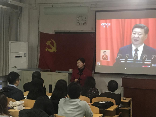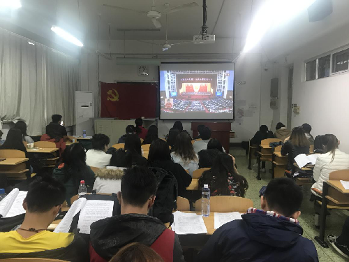 2017年10月18日上午九时,中国共产党第十九次全国代表大会在在人民大会堂正式开幕,中共中央总书记习近平代表第十八届中央委员会向党的十九大作报告。中午十二点半,香蕉视频 党总支书记付琳、香蕉视频 党总支副书记、院长石刚、各教师党支部书记,部分教师党员带领全体学生党员和入党积极分子一起观看了十九大开幕会录播,师生党员认真学习党的十九大会议精神。付琳也代表党总支部对下一阶段开展十九大报告的理论学习研讨工作进行了部署和要求。
