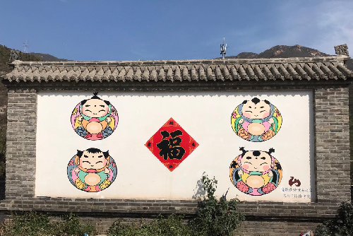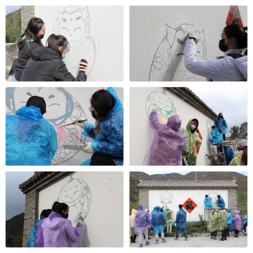 10月14日清晨,师生们迎着朝霞出发,一路向北来到石峡村,紧锣密鼓地开展绘画工作。在延庆接近零度的气温和凛冽的寒风中,学生党员和入党积极分子不畏严寒,坚持工作,构图、起草、描边、上色……经过两天的奋战,墙绘基本成型,最终完美呈现了前期设计,四个福娃与墙体中央的福字相辅相成,表达了村民们对美好生活的憧憬和对幸福生活的向往,与乡村秀美的风光和古老的民俗相得益彰。