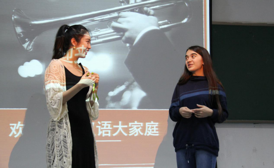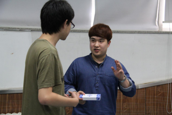 参观结束后,留学生们来到了13级汉语国际教育班的课堂上,两个班级进行了丰富而精彩的互动。首先是结对子活动,两个班各十四位同学,各执绳子的一端,牵着同一根绳子的两人即结对。随后十四对结对伙伴都上台向大家进行了自我介绍。在大家互相认识之后,13级汉语国际教育班的同学们拿出了早已准备好的礼物,赠送给了自己的结对伙伴,在这个过程中,双方学生开心地交流、互留微信。之后,为表达对留学生们的欢迎,13级汉语国际教育班的同学进行了精彩的歌舞表演,引得满堂的鼓掌与喝彩。
