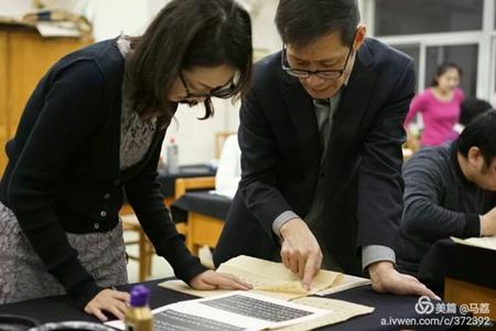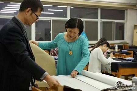 宫老师为营员参加校庆六十周年的书画展的作品挑选纸张