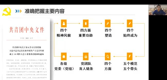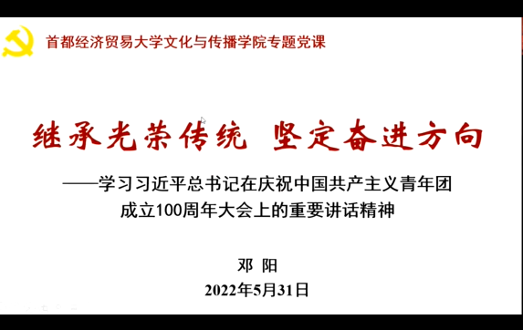 2022年5月10日上午,庆祝中国共产主义青年团成立100周年大会在北京人民大会堂胜利召开,中共中央总书记习近平同志在大会上发表重要讲话。为庆祝建团100周年,喜迎党的二十大,让学生党员更好地了解中国共产党、中国共青团的光辉历史,继承和发扬优良传统精神,2022年5月31日,香蕉视频 党总支开设党课《继承光荣传统 坚定奋进方向——学习习近平总书记在庆祝中国共产主义青年团成立100周年大会上的重要讲话精神》。
