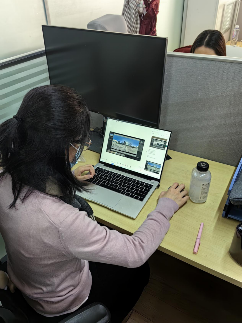 1月20日,在作品制作阶段,席田亮老师指导同学们使用全景拼合软件,确保作品视觉完整。经过优化,同学们完成国家大剧院、北京坊VR体验馆全景图片制作,为全景新闻制作提供实训样本。