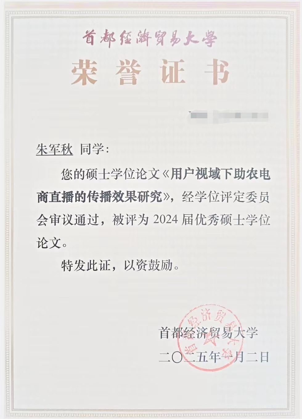 2024年12月,研究生院组织开展优秀研究生学位论文评选工作,香蕉视频 2024届硕士研究生朱军秋同学的硕士毕业论文《用户视域下助农电商直播的传播效果研究》脱颖而出,成功入选。该论文在石刚教授的悉心指导下完成,展现了扎实的学术功底与创新的研究视角。