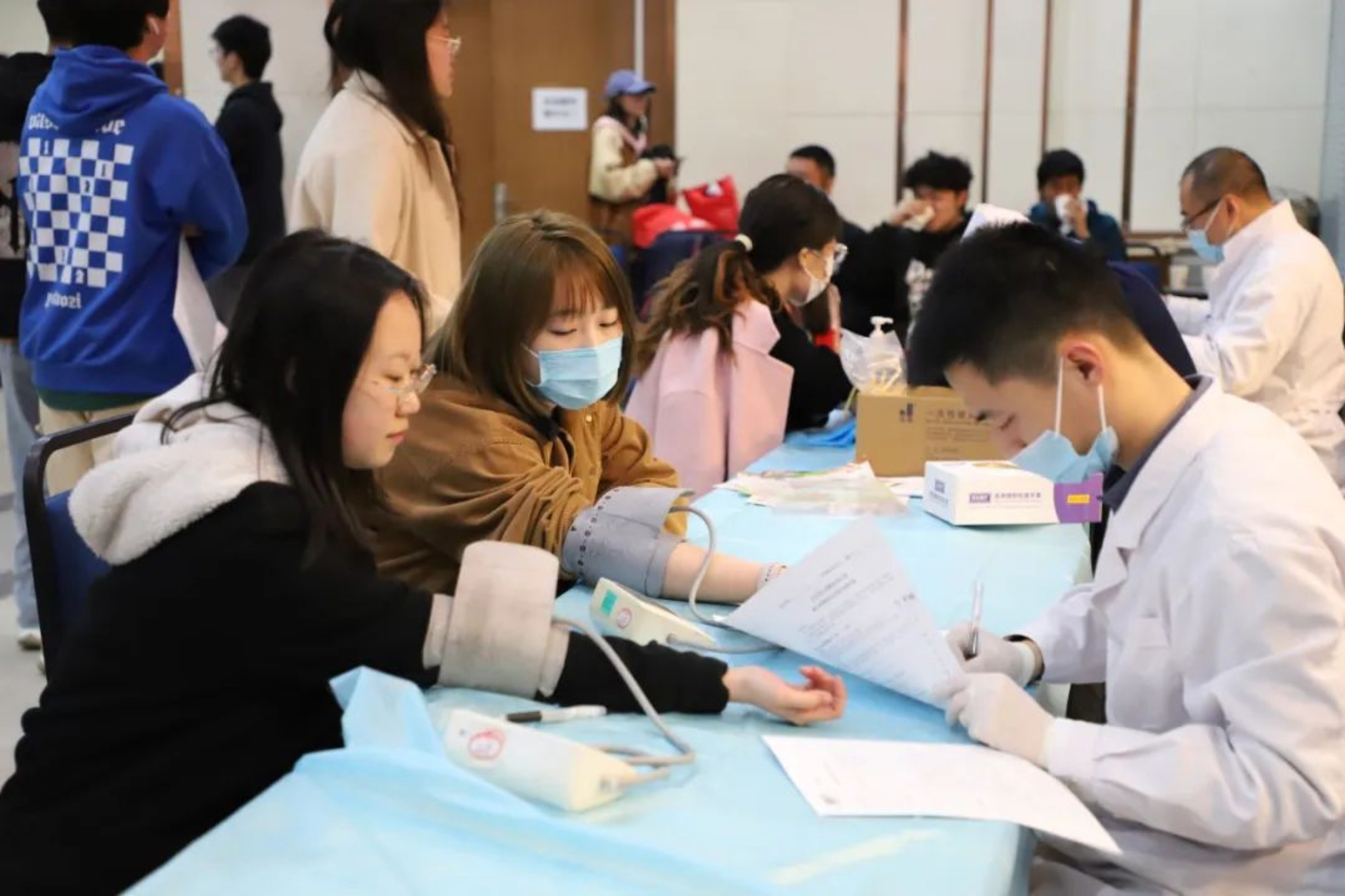 为了做好服务保障,志愿者们早早到达大学生活动中心进行准备工作,他们将提前为献血者准备的早餐和营养品取出,并开始准备签到工作。随后参与献血的同学们陆续到场。九点开始,在志愿者和医护工作者的指引下,参与献血的同学们依次进行登记、体检和献血,献血成功的同学们领取了献血证,学校和学院准备的慰问品,收获了奉献他人的快乐和使命感。