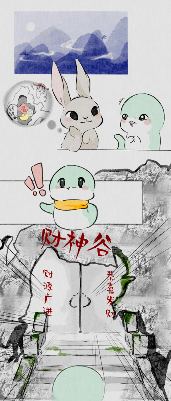 大年初五,正值迎财神的日子,山水万物皆沐浴在一片喜庆与期盼之中。小青蛇听见多识广的兔子姐姐讲:神秘的东方有一个财神谷,那里居住着一位拥有无上能力的财神爷爷,他不仅掌管着整个奇幻世界的财富,更能为万物带来好运与福祉。怀着对美好未来的憧憬,小青蛇毅然决然地踏上了前往财神谷的路。