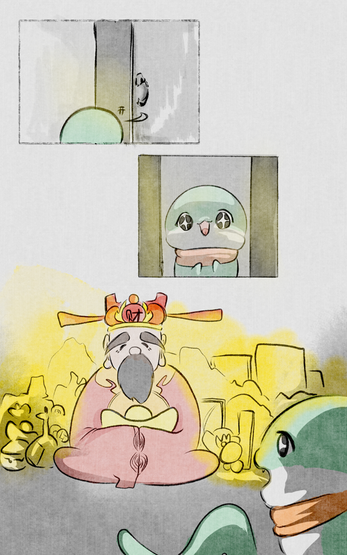 小青蛇小心翼翼地推开石门,步入了这片传说中的丰饶宝地。财神谷内金光闪闪,璀璨夺目,四周遍地皆是金银财宝。正中坐着慈眉善目的财神爷,他身着一袭红色长袍,上面遍绣金色花纹,手持一枚金光闪闪的元宝,面容和蔼可亲,眼中满含智慧与慈爱。见到小青蛇的到来,财神爷笑着问道:“小蛇啊,你可是为了迎接财神而来?”小青蛇恭敬地点了点头,答道:“是的财神爷,我希望在新的一年里能得到好运,也希望能帮助我的朋友们。”财神爷闻言,轻轻颔首,随即从身旁的宝箱中取出一枚镌刻着“好运”的金色铜钱递予小青蛇,语重心长地说:“这枚铜钱,代表着好运和财富。你把它带回去,放在你最珍视的地方,它会给你带来好运。”小青蛇双手接过铜钱,连声道谢。