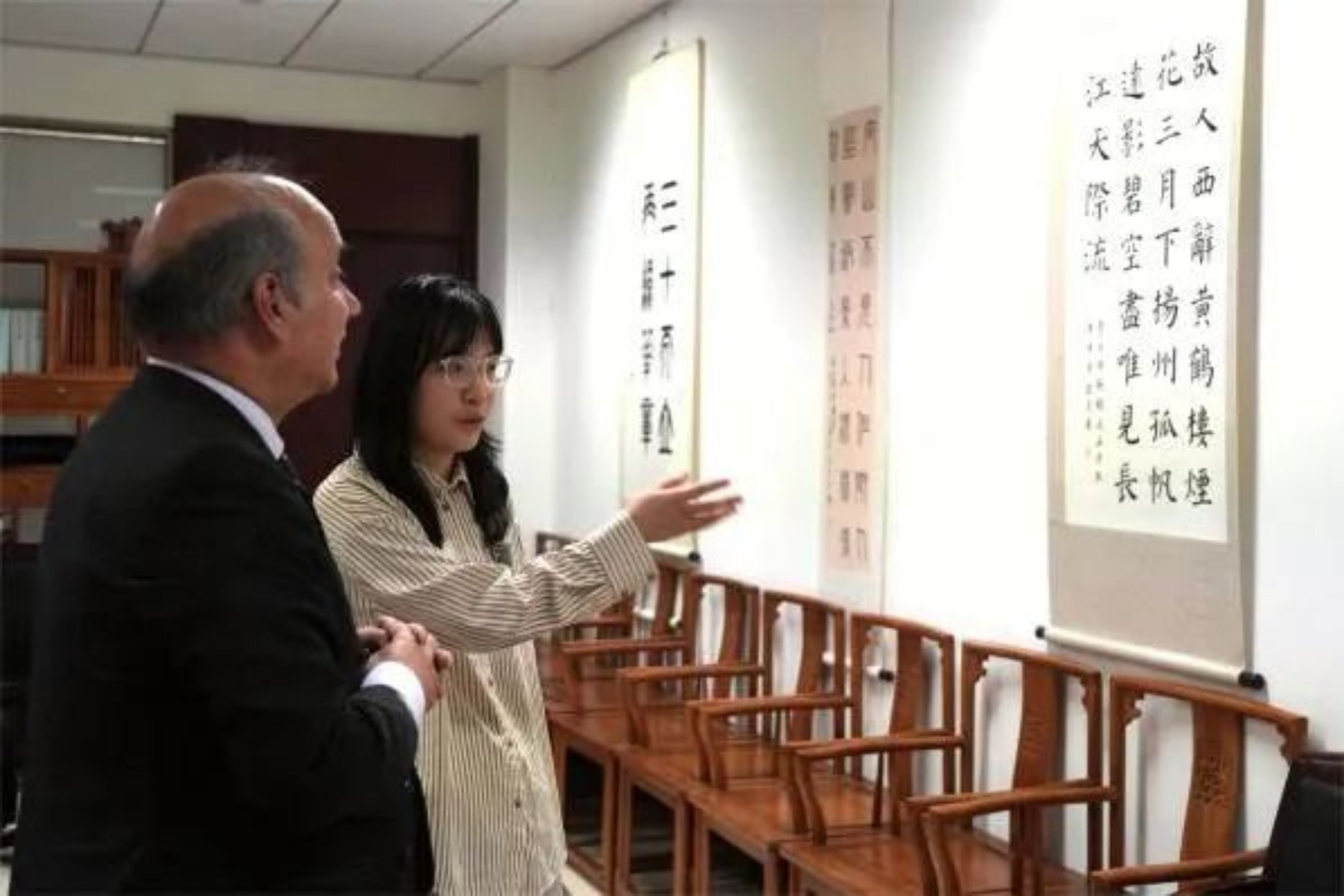 会谈结束后,Stephen参观了香蕉视频 的国学与艺术中心,对学院的教学环境和设施给予了高度评价。参会的老师与学生则热情地向其详细介绍了展出的书法作品,双方交换精心准备的礼物。