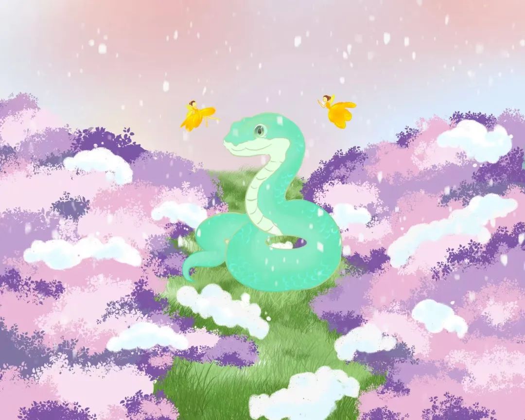 小青蛇摆动着灵活的身躯悠悠前行,抵达了一片如梦似幻、神秘莫测的花海。在皑皑白雪的映衬下,朵朵花儿愈发娇艳夺目。凑近细嗅,一缕清幽的香气萦绕鼻尖,仿佛有一种直抵人心的力量,让人在这寒冷的冬日里,感受到生命的蓬勃与不屈。正当小青蛇沉醉其中之时,一群小巧玲珑的花朵精灵翩然而至,“新春佳节喜洋洋,梅绽枝头送吉祥。愿你阖家欢乐福满院,如意安康绽光芒。” 它们的歌声清脆悦耳,每一个音符都饱含着深深的祝福。“谢谢你们,梅花精灵!”小青蛇激动地说。