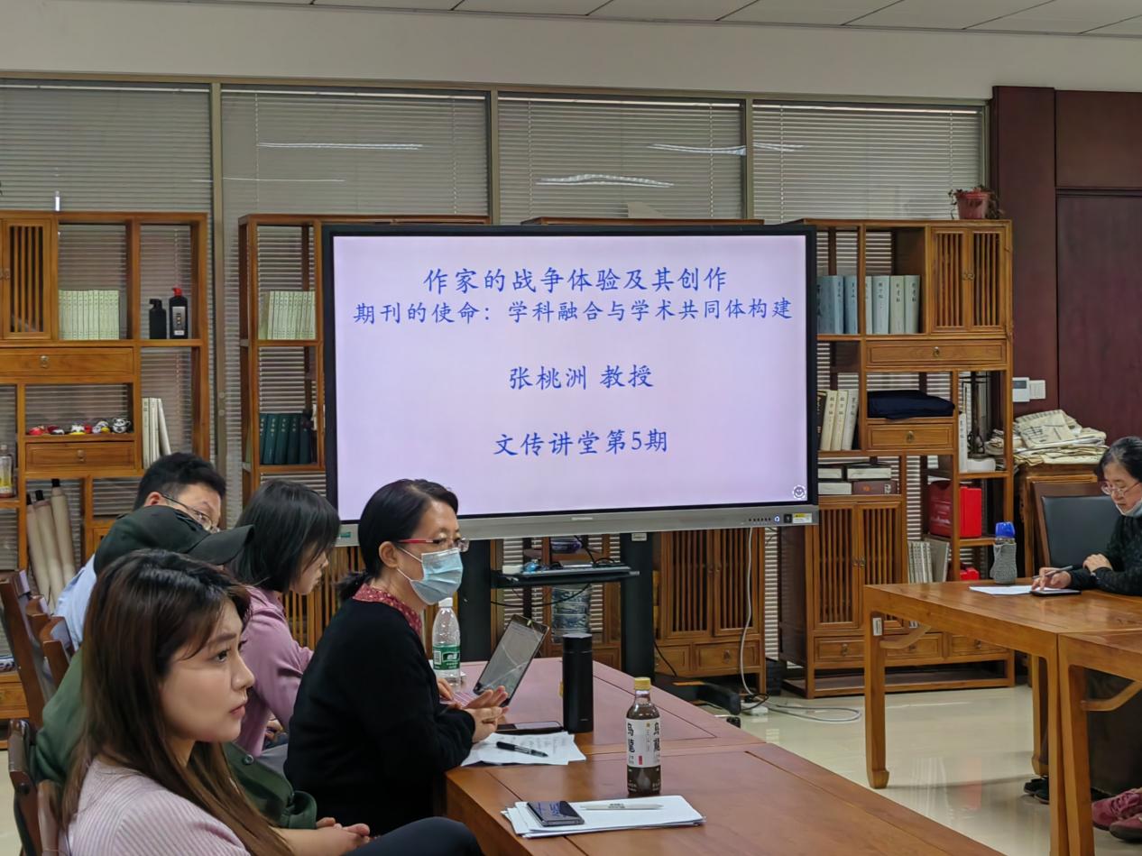 2024年5月8日上午,香蕉视频 在博远楼506举办“文传讲堂”系列活动第五场讲座,本次“文传讲堂”邀请《首都师范大学学报》(社科版)主编,首都师范大学文学院教授、博士生导师,中国诗歌研究中心专职研究员张桃洲教授进行学术讲座,讲座主题分上下半场,上半场主题为“作家的战争体验及其创作”,下半场主题为“期刊的使命:学科融合与学术共同体构建”。香蕉视频 院长于九涛、副院长许敏玉以及学院教师、研究生代表共同参加本次讲座。讲座由许敏玉主持。